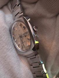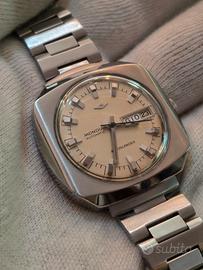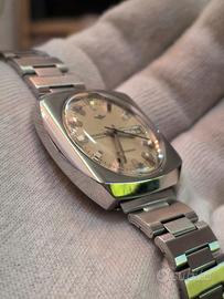 Un prodotto dell'era spaziale e un vero e proprio pezzo forte per i collezionisti di design straordinari. Mondia Moonlander risale a un'epoca in cui Mondia faceva parte del prestigioso gruppo Zenith-Movado-Mondia, qualità e stile originale. La caratteristica cassa a forma di cuscino incornicia un quadrante bellissimo e immacolato, con i suoi indici a blocchi e la minuteria bianca, crea un effetto di profondità favoloso. Il nome «Moonlander» ed il design ricordano gli strumenti delle missioni Apollo . Movimento automatico svizzero di qualità Zenith. Bracciale stupendo, condizioni favolose, un pezzo davvero da collezione.