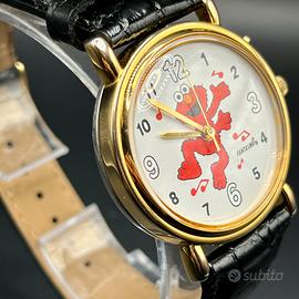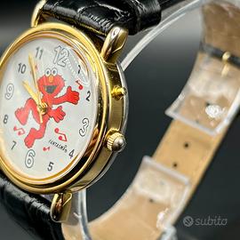 Splendido orologio vintage da collezione firmato Fantasma (Jim Henson Productions), dedicato al celebre personaggio Elmo di Sesame Street. Un pezzo raro degli anni '90, perfetto per appassionati di memorabilia o amanti dello stile retro. Caratteristiche principali: • Design Unico: Quadrante bianco con Elmo danzante circondato da note musicali. • Funzione Musicale: Dotato di un tasto laterale (sopra la corona) che attiva una simpatica melodia. • Cassa: Finitura dorata elegante con fondello in acciaio inossidabile, • Cinturino: In pelle nera con trama a coccodrillo, originale e ben conservato. • Movimento: Quarzo giapponese di alta qualità. • Dimensioni: Cassa da circa 33-34 mm (ideale per polsi sottili, ragazzi o come pezzo da esposizione). Stato del prodotto: L'orologio è in ottime condizioni estetiche, come mostrato nelle foto. Il vetro è pulito e la placcatura dorata mantiene la sua lucentezza originale. Batteria: nuova. Scatola: nuova non originale con possibilità di scelta del colore bianco, nero o blu. Tag #Elmo #Sesame Street #VintageWatch #FantasmaWatch #JimHenson #Collectible #OrologioVintage #Anni90 #90sStyle #RareWatch #LionelWatch #Muppets #OrologioMusicale