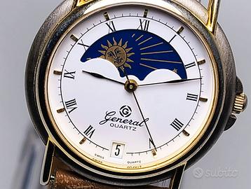 Elegante orologio vintage Night & Day fine anni '70, Swiss Made, cassa e movimento Svizzero "FE France Ebauche" oggi ETA. Quadrante bianco numeri romani e datario ad ore sei, sfere a lancia nere, secondi oro. Finestra con alternanza giorno e notte. Orologio di fine anni 70, marchio General. Cassa in acciaio spazzolato con inserti oro in ottimo stato di conservazione come da foto hd, cinturino da 18 mm in pelle originale. Vetro senza graffi. Funziona perfettamente, è stato smontato e ripulito da orologiaio. Molto preciso. Misure 34x35x7.5 mm, 29 grammi.