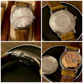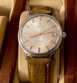 Orologio classico Omega Seamaster Automatic del 1962 da collezione, Referenza 166.001. Questo orologio è animato dallo stimatissimo calibro 562 con finitura ramata (24 rubini) e numero di serie 19.675.647, che ne conferma la data di produzione al 1962. La caratteristica distintiva di questo esemplare è l'autentico quadrante originale argenté soleil con indici a bastone applicati in acciaio e logo Omega applicato; non è mai stato ristampato o restaurato, preservando così il suo carattere vintage e il suo valore. La cassa presenta l'iconico logo dell'Ippocampo sul fondello. L'orologio è funzionante, inclusa la complicazione del datario; naturalmente si raccomanda una revisione per garantirne stabilità e precisione, in quanto mancano attualmente le due viti di fissaggio e le relative brite, che dovranno essere sostituite per bloccare completamente il movimento all'interno della cassa. L'orologio necessiterebbe inoltre di un vetro nuovo, interventi comunque di lieve entità. Ciononostante, questa rimane un'ottima opportunità per possedere un modello Seamaster da collezione e con quadrante originale appartenente all'era d'oro dell'orologeria Omega. Grazie!