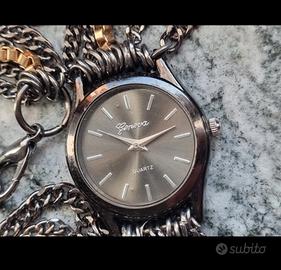 Orologio vintage con catene, diventa come un bracciale. Acciaio inossidabile, le batterie sono da cambiare. Ottime condizioni. Peso 64g.