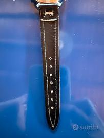 Pobeda (ПОБЕДА, "Vittoria"), storico marchio dell'orologeria sovietica. Questo modello, risalente presumibilmente agli anni '70/'80, è un perfetto esempio di design minimalista ed elegante dell'epoca socialista. L'orologio si presenta in condizioni estetiche eccezionali, definibili come "usato come nuovo": la cassa cromata è lucida e il quadrante nero è impeccabile, creando un contrasto perfetto con gli indici e le lancette a foglia dorate. Caratteristiche Tecniche Movimento: Meccanico a carica manuale (Calibro 2602), robusto e affidabile. Quadrante: Nero profondo con finiture dorate e piccoli secondi a ore 6. Stato di conservazione: Eccellente, vetro privo di graffi e cassa priva di segni d'usura evidenti. Funzionamento: Perfettamente funzionante, tiene bene il tempo. Cinturino: In pelle nera, pronto per essere indossato. Perché acquistarlo? Il Pobeda non è solo un orologio, ma un pezzo di storia. Questo specifico modello con quadrante nero è molto ricercato per la sua versatilità: elegante sotto un polsino di camicia, ma con un carattere deciso per l'uso quotidiano. Difficile trovarne uno in queste condizioni di conservazione.