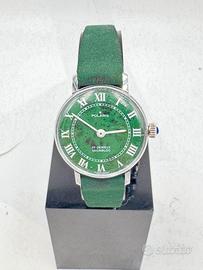 Splendido orologio Marca: Polaris Modello: 17 Jewels Incabloc Riferimento: Vintage "Stone Dial" Style Anno: 1970 - 1975 circa Vetro: Esalite (Plexiglass) Corredo: Solo orologio Movimento: Meccanico a carica manuale (Swiss Made) Materiale cassa: Metallo cromato / Acciaio (con cabochon blu sulla corona) Bracciale: Cinturino in scamosciato verde (circa 20 cm) Diametro: 21 mm (esclusa corona) Orologio, perfettamente funzionante. Distinti saluti