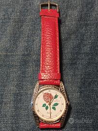 Vendesi orologio vintage da donna Prince Swiss Made anni '80-'90 in ottime condizioni perfettamente funzionante. L'orologio presenta una cassa intarsiata da 30mm in ottime condizioni con profilo laterale dorato. Vetro minerale con impercettibili segni da normale utilizzo. Il suo quadrante bianco è impreziosito da una delicata rosellina disegnata, decorata con brillantini rossi per il fiore e verdi per le foglie, che aggiungono un tocco romantico e distintivo. I numeri neri romani, finemente stampati lungo il bordo del quadrante, conferiscono un fascino classico e senza tempo, mentre le lancette dorate si stagliano con grazia sul quadrante, garantendo una lettura chiara e sofisticata dell'ora.