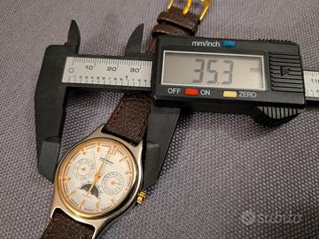 Vendo bellissimo orologio al quarzo vintage perfettamente funzionante, ha anche la finestrella che fa apparire la luna nelle ore notturne e il sole durante quelle diurne. Molto elegante l'alternanza della cassa satinata in acciaio con la corona e la lunetta dorate , dimensioni 35 mm corona esclusa , orologio in condizioni strepitose con cinturino nuovo. Scambio solo a mano a Fiorenzuola d'Arda (PC) a 40 euro. Non spedisco.