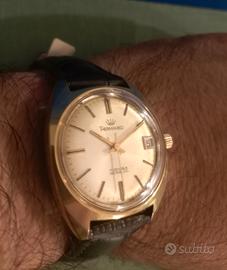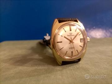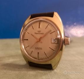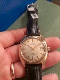 FINESTRELLA DATA NUMERICA SITUATA AD ORE 3 PERFETTAMENTE SCATTANTE ALLA MEZZANOTTE E SETTABILE ALLA MEZZANOTTE . INDICI APPLICATI A RILIEVO , SFERE LANCETTE A BASTONE , SFERA LANCETTA DEI SECONDI AL CENTRO AD AGO . CASSA DI FORMA TIPICA DEGLI ANNI 60 , AD OVETTO , PLACCATA ORO , DI DIMENSIONI : 40X34 MM ESCLUSO CORONA DI CARICA . FONDOCASSA SERRATO A VITE E CON TUTTE LE SUE DICITURE.