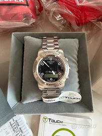 Orologio vintage Tissot T-Touch z251/351 T33.1.488.51 in acciaio inossidabile con movimento al quarzo, display analogico digitale con cassa multifunzione, vetro zaffiro. Disponibili funzioni come bussola, altimetro. barometro e cronografo touch screen. Resistente all’acqua sino a 30 metri di profondità.