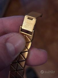 Titolo: Orologio vintage donna Vetta dorato – elegante anni ‘80 Descrizione: Vendo elegante orologio da donna marca Vetta (Wyler Vetta), dal design vintage anni ‘80/‘90. Cassa e cinturino color oro con lavorazione particolare a maglie geometriche, molto raffinato e ancora attuale. Quadrante dorato con finitura radiale, essenziale ed elegante. L’orologio è in buone condizioni estetiche, con normali segni del tempo (come da foto), che ne testimoniano l’originalità vintage. Sul retro è presente il codice modello 10822. Ideale sia per uso quotidiano che come accessorio vintage. Caratteristiche: - Marca: Vetta - Movimento: quarzo - Colore: dorato - Modello: 10822 - Cinturino originale Condizioni: Usato, con segni di usura sulla doratura. Prezzo: 50 € (trattabili) Disponibile per consegna a mano .