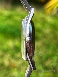 Il quadrante presenta una complessa lavorazione guilloché a settori con un motivo a 'chicco di riso' centrale e cerchi concentrici esterni