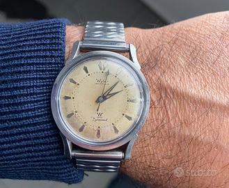 Orologio anni 50 automatico, mod Dynawind, dotato del sistema Incaflex, ben funzionante con sfere davvero intriganti, quadrante bitonale con patina uniforme, indici applicati. Cassa waterproof da 33mm in acciaio dotato di particolari ed eleganti anse e con la corona a scomparsa salva polsini, dotato di un bracciale vintage.