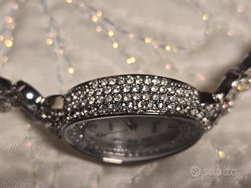 Il design è ricco e decorativo: fascia in metallo argentato con pietre colorate (rosso, verde, giallo) e strass trasparenti, quadrante ovale bianco con numeri arabi ben leggibili.