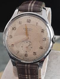 orologio classico swis made degli anni 60 marca daniel, in ottime condizioni generali, Cassa perfettamente cromata da 36 mm movimento. sistemato dal mio orologiaio qualche mese fa vetrino e cinturino nuovi bellissimo quadrante con lavorazione a nidi d ' Api e indici applicati in oro