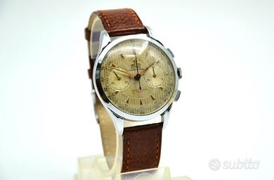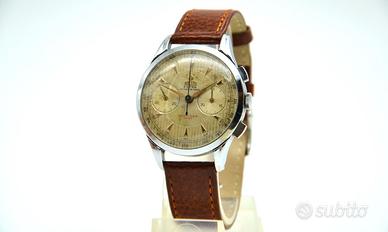 Orologio Walker Extra, cronografo vintage, cassa da 38 mm. esclusa corona, movimento a carica manuale, cinturino in pelle marron. L'orologio marcia perfettamente comprese le funzioni crono, ma non conosco la data dell'ultima revisione. Scambio a mano o spedisco previo bonifico ricevuto.