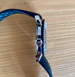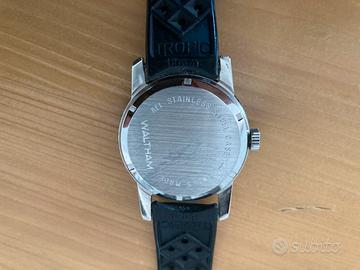 Orologio Waltham (Swiss made) Skin Diver Vintage anni 60 usato in ottime condizioni, revisionato nel 2025. 17 rubini Incabloc, carica manuale, con data ad ore 3. Il cinturino è un Tropic originale vintage, sempre anni 60, in condizioni perfette. Non è garantita l'impermeabilità di questo orologio perchè non è stato testato! Si prega di osservare attentamente tutte le fotografie, che fanno parte integrante della descrizione.