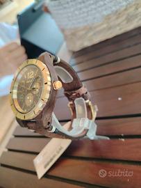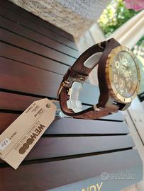 Nuovo, mai usato, senza confezione, Cronografo, quadrante legno, movimento quarzo, fondo effetto legno, cintutino legno