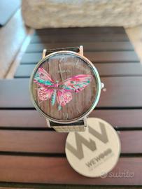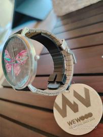 nuovo, mai usato, senza confezione, movimento quarzo, cassa legno, waterproof, quadrante Farfalla, cinturino legno