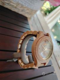 nuovo, mai usato, senza confezione, movimento quarzo, cassa Legno, datario, quadrante legno con zirconi, cinturino legno