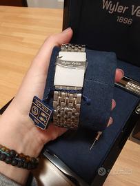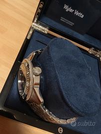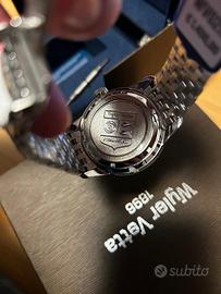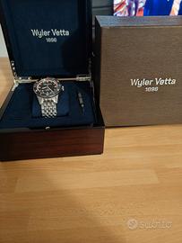Orologio Wyler Vetta Diver Jumbostar 660 SPECIAL EDITION - Impermeabilità fino a 200 metri. - Orologio animato da movimento meccanico a carica automatica (calibro Landeron 24). - Quadrante nero con indici rossi - Diametro da 43mm - Datario tra le ore 7/8 - Ghiera unidirezionale - bracciale in acciaio a chicchi di riso. - Orologio nuovo, pellicolato, corredato scatola contro scatola e garanzia. Prezzo di listino €1400
