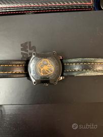Orologio marca yell industry modello dietrich ot-04 serie edizione limitata n44/100 con quadrante scheletrato con bilanciere visibile movimento automatico miyota cassa forma esagonale olte 47mm finitura nera cinturino in pelle nera con cuciture color giallo che richiama dettagli del quadrante