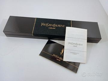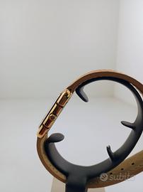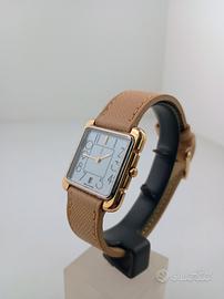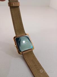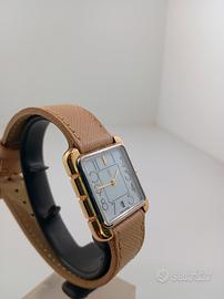 orologio Yves Saint Laurent in acciaio placato oro giallo,cassa carre' da cm30 x cm27,quadrante bianco con datario a ore 3.Movimento al uarzo con batteria appena sostituita,cinturino in pelle saffiano color Moka nuovo.Mai indossato stock di magazzino completo di scatola originale e documenti