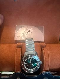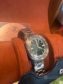 Zelos pesce spada Swordfish 40mm TI verde smeraldo comprato da sito ufficiale Zelos a maggio 2025 al prezzo di $ 429,00 +spese di dogana, completo di carta in rame di garanzia. Mai insossato ancora con plastiche di imballo attaccate.