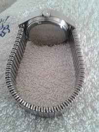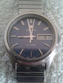 Orologio non funzionante ma riparabile, è un orologio particolare x intenditori, movimento continuo non a scatti, a induzione (bobine rovinate) quadrante viola, indicatore giorno settimana + giorno mese, visione notturna, cinturino a molla elastica adattabile a polsi + o - grandi.