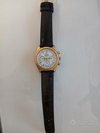 ZENITH El Primero 20.0210.400 Orologio automatico cronografo da polso anni 90. Cassa laminata oro giallo da 38 mm. Le superfici sono interamente lucide. Il quadrante bianco ceramica, riporta indici e grafiche stampate e finiture in oro. Il datario è posizionato tra il 4 e il 5. Protetto da un vetro zaffiro bombato con trattamento anti riflesso. Il fondello è in acciaio e chiuso a pressione e riporta logo, referenza e specifiche del modello. Cinturino nuovo in coccodrillo. Usato pochissimo. Perfettamente funzionante.