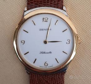 Vendo bellissimo orologio da polso unisex, si tratta di uno Zenith originale, modello Silhouette con cinturino in lucertola. Bellissimo ZENITH, serie "Silhouette" , quadrante classico bianco con indici in oro applicati perfetto, lancette sottili placcate oro il logo ZENITH è serigrafato in nero.