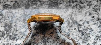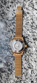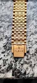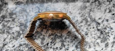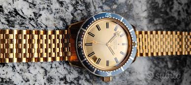 "Zenith Sub Sea Ref. P3632, seriale 218D525 (circa 1969). Cassa placcata oro 20 micron in condizioni originali, mai lucidata. Quadrante originale con magnifica patina trizio. Monta bracciale originale NSA Zenith con chiusura elastica perfettamente funzionante. Movimento automatico cal. 2552 PC." Segni usura come evidenziato in foto