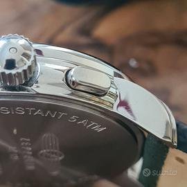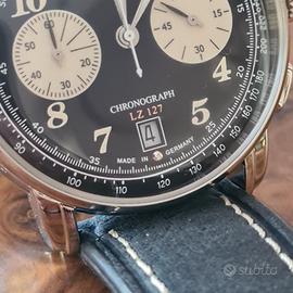Sono un collezionista di orologi sia Moderni che Vintage. Vendo questo bellissimo Zeppelin LZ 127 Graf Chronograph 8674-3 è un elegante cronografo dal design vintage e raffinato, ispirato all'era dei dirigibili Zeppelin, con una cassa in acciaio inox dal diametro di 43 mm e spessore contenuto, adatta a un polso maschile moderno ma con gusto classico. Il quadrante nero ospita numeri arabi con lume vintage e due contatori cronografici, oltre a una finestra data posizionata in modo funzionale, il tutto protetto da un vetro minerale leggermente bombato che dona profondità estetica e robustezza. Il cinturino in pelle testa di moro con cuciture a contrasto completa questo segnatempo dallo stile senza tempo, alimentato da un movimento al quarzo di qualità, affidabile e preciso, con una resistenza all'acqua di 50 metri.