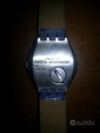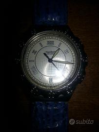 BELLISSIMO OROLOGIO USATO POCO COME NUOVO,VINTAGE,INTROVABILE UGUALE,non so se sia da donna o uomo,Con CINTURINO IN VERA PELLE azzurro scuro/blu,originale MARCA:"SWATCH"SWISS MADE(made in svizzera),CON QUADRANTE IN ACCIAIO CON DATARIO(con giorno del mese),CON LANCETTE FLUORESCENTI al buoi,"STAINLESS STEEL(dietro il quadrante),"patented waterresistant"(RESISTENTE ALL'ACQUA BREVETTATO c'è scritto dietro il quadrante che è resistente all'acqua ma meglio non metterlo nell'acqua per non rovinare il cinturino ORIGINALE SWATCH IN VERA PELLE),FUNZIONANTE PERFETTAMENTE(solo la batteria è scarica,ho la batteria scarica così sapete quale va comprata costa 5-6 euro circa e te la mettono loro in gioielleria/orologeria,se volete sò dirvi dove cambiare la batteria qui dalle mie parti o se lo volete acquistare a distanza se pagate la batteria voi ve la faccio cambiare io),CON RUOTA METALLICA SOPRA IL QUADRANTE CHE GIRA(senso orario),TENUTO BENISSIMO,SENZA DIFETTI solo il cinturino ha un leggero segno sulla pelle dove ha la mia misura del polso ma leggero con sopra dei pesi o libri pesanti e l'orologio dritto diminuisce il segno che è normale che ci sia avendo usato 2-3 volte l'orologio,con blocca cinturino in metallo con scritta:"swatch"(vedi foto).
