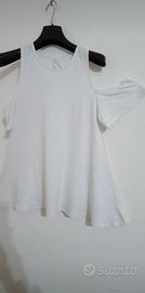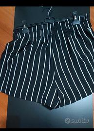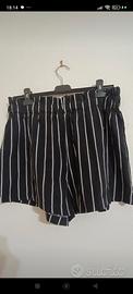 Outfit da donna composto da shorts e maglia coordinata, ideale per un look estivo semplice ma curato. • Shorts neri a righe bianche: modello con elastico in vita, molto comodi e facili da indossare. Fantasia a righe verticali che slancia la figura. Tessuto leggero e morbido. • Maglia bianca con spalle scoperte: modello fluido e moderno, con taglio “cold shoulder”. Girocollo e chiusura posteriore con piccolo bottone. Tessuto morbido e vestibilità ampia. Caratteristiche: Taglia: XL (entrambi i capi) Vestibilità morbida e confortevole Tessuti leggeri, ideali per la stagione calda Outfit già abbinato, pronto all’uso Condizioni: ottime, pari al nuovo