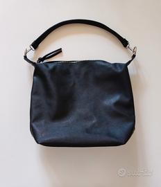 Borsa a spalla nera con borchie argentate, piatte e lisce. Capiente, può essere portata anche a tracolla grazie alla tracolla aggiuntiva.