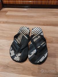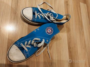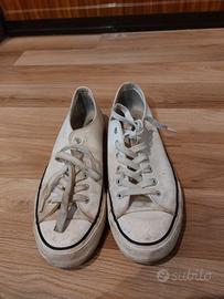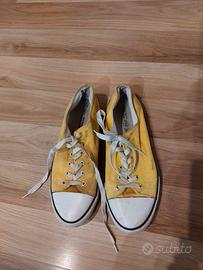 7 paia di scarpe da uomo numero 44/45: 3 paia di converse blu, gialla e bianca perfettamente tenute. Un paio di scarpe da ginnastica bianche, leggermente sporche ma in ottimo stato. Un paio di stivaletti morbidi neri, leggermente rovinate esteriormente in particolare dietro al tallone. Due paia di infradito, una Marvel ed una Billabong. Disegni leggermente consumati ma non rotte