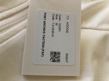 PAF Hoodie 7.0 Right. Colore avorio. Cotone/poliestere con tessuti a contrasto. due tasche laterali. Doppia zip. Cappuccio. Spacco sul retro. Nuovo con etichetta. Costo originale d’acquisto $450. Spalle cm50, petto cm 56, lunghezza cm68. Prezzo per la singola felpa leggermente trattabile essendo già scontato del 20% del prezzo originale d’acquisto.