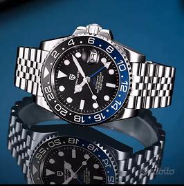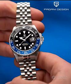 Pagani Design PD-1662. GMT. Versione con movimento automatico Seiko NH35 visibile dal fondello. Cassa da 40 mm di diametro in acciaio inossidabile 316L. Spessore cassa 14 mm. Vetro zaffiro. Lunetta in ceramica. Bracciale in acciaio inossidabile 316L. Indicazione del secondo fuso orario. Datario con lente cyclope. Peso 137 grammi. Nuovo con dotazione completa Full Set. Splendido