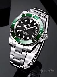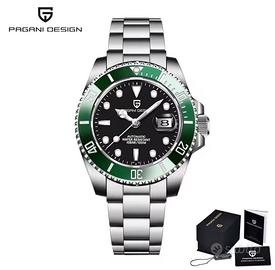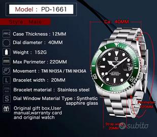 Pagani Design PD-1661. Movimento automatico Seiko NH35 visibile dal fondello. Cassa da 40 mm di diametro in acciaio inossidabile 316L. Spessore cassa 12 mm. Vetro zaffiro. Lunetta in ceramica. Bracciale in acciaio inossidabile 316L. Datario con lente cyclope. Peso 152 grammi. Nuovo con dotazione completa Full Set
