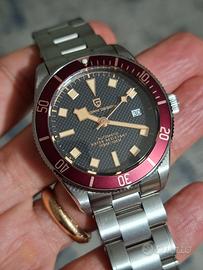 Orologio con un bell'aspetto vintage, con 42 mm di diametro cassa, vetro zaffiro, ghiera in alluminio di colore rosso invecchiato che si abbina perfettamente a indici e lancette, movimento automatico nh35, bracciale da 20 mm di buona qualità con clasp loggata, resistenza all'acqua 100 metri, l'orologio è nuovo, completo di tutto, spedizione con posta prioritaria tracciabile in un giorno...
