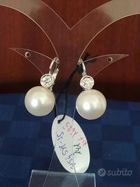 Paio di orecchini con perle coltivate e diamanti, realizzato in oro bianco 750, diamanti taglio brillante ct 0,40 ca totale, colore H-J, purezza VS-S1, chiusura ponte, perle mm 13 ca. lunghezza cm 2,6 ca