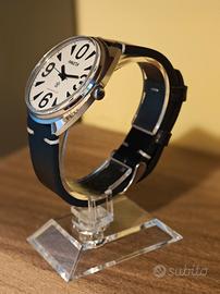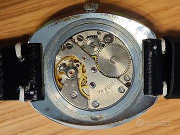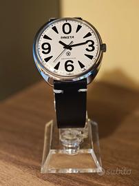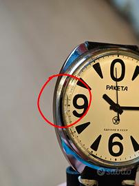Raketa Big Zero, uno degli orologi sovietici più celebri al mondo. Movimento mccanico a carica manuale, calibro originale 2609.HA. Quadrante bianco con i caratteristici indici neri sovradimensionati, in ottime condizioni estetiche. Cassa "cushion" originale con segni di usura coerenti con l'età. Nota estetica: Presente una piccola crepa sul vetro acrilico a ore 9, visibile solo da certe angolazioni, visibile in foto. Cinturino in pelle nera con cuciture a contrasto.