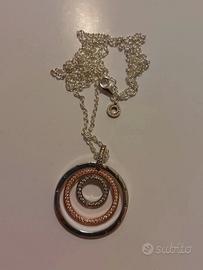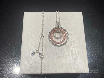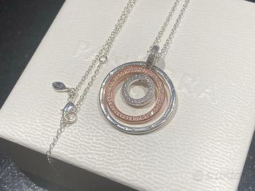 Rifinita a mano e realizzata in argento sterling originale 925 e con placcatura in oro rosa, la collana è caratterizzata da tre cerchi girevoli. Il cerchio esterno include i loghi Pandora su un lato, mentre l'altro lato è lucido; il cerchio di mezzo con placcatura in oro rosa 14k presenta un pavé di pietre di zirconia cubica incolori incorniciato da micro-sfere da un lato e da cuori intagliati dall'altro; il cerchio centrale mostra un pavé incorniciato da micro-sfere su un lato e il logo Pandora sul retro. I cerchi possono essere girati creando otto diverse combinazioni di stile.