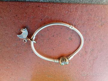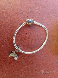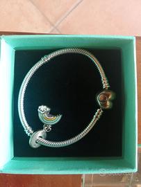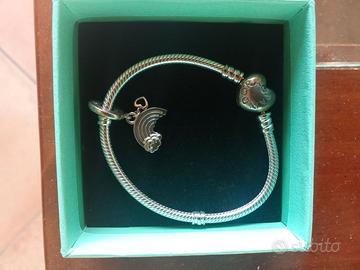 Bellissimo bracciale Pandora in argento, completo di charm con cuorinicini e un colorato charm arcobaleno con nuvoletta. Tutto in perfetto stato, nuovi e mai indossati!
