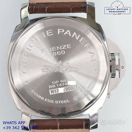 Orologio Panerai originale in ogni sua parte, edizione limitata di soli 2.000 esemplari, revisionato in ottime condizioni, segni di usura assenti o appena visibili, full set (scatola generica, accessori vari e garanzia card originale Panerai), garanzia/dichiarazione di vendita nostro negozio valida 12 mesi.