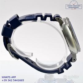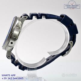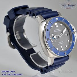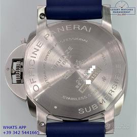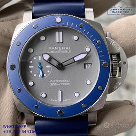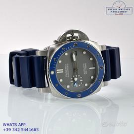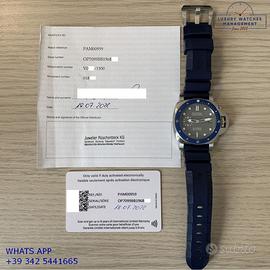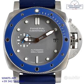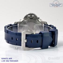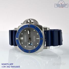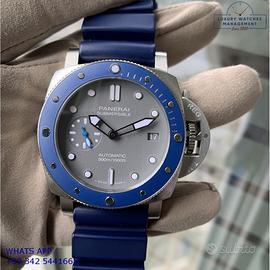 Panerai Luminor Submersible PAM00959 42MM acciaio, anno di produzione 2022, ghiera unidirezionale in acciaio con inserto in ceramica colore blue a scala graduata, vetro zaffiro piatto antiriflesso, quadrante colore grigio con contatore dei secondi a ore 09:00 e datario a ore 03:00, indici e sfera SuperLumiNova, movimento meccanico a carica automatica, cinturino in gomma colore blu scuro con fibbia in acciaio originale Panerai, più altro cinturino Panerai in gomma rivestito in tessuto colore nero.