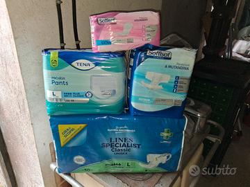 Pannolini Lines con Mutand. Qt.120 mis.L. mis.M Qt. 30 Pannolini TENA con Mutand.Qt.86 mis.L / Pannolini Soffisof mis.M Qt.270 Salvaslip Qt.70