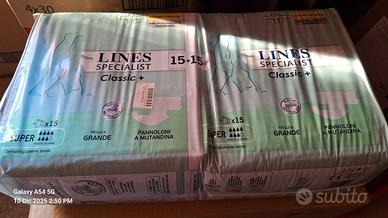 vendo 4 confezioni da 30 pezzi ciascuna pannoloni a mutandina Lines Specialist +, misura grande, € 10 cadauna;