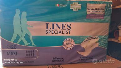 vendo 4 confezioni da 20 pezzi ciascuna pannoloni a mutandina Lines Specialist, misura grande € 10 cadauna.