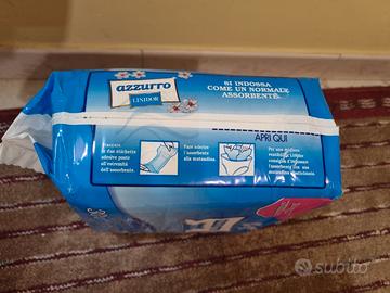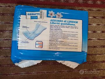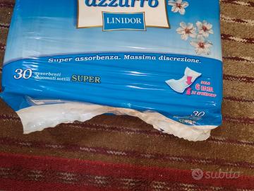 Articolo Linidor Azzurro, formato da 30 pannoloni sagomati sottili, imballati. Contro il bagnato, contro gli odori, contro le irritazioni, super assorbenza, 6mm di spessore e disegnato per aderire perfettamente al corpo. Nessun difetto da segnalare. Nuovo.