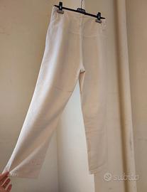 Pantalone 100% cotone a vita alta. Chiusura con zip e doppio bottone. Indossato pochissimo, presenta due piccole macchie nella parte bassa della gamba sinistra sul retro (ultima foto) ma non sono state fatte prove di lavaggio. Taglia S.