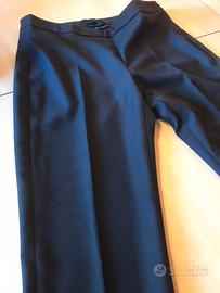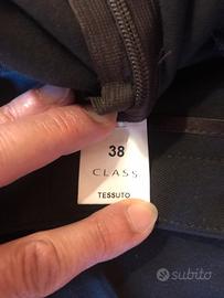 Indossati, ma ben conservati. Taglia 38, colore nero, 63% poliestere, 34% viscosa, 3% elastan. Con spacchetto a fine gamba. Class Misure: girovita cm 77, lunghezza pantalone cm 90.
